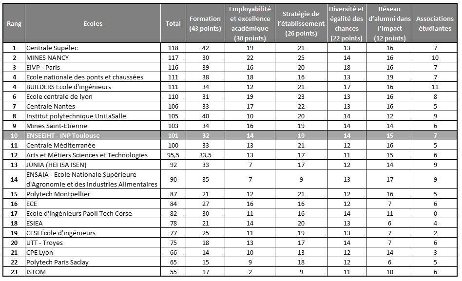 10ème dans ce classement 2025 des écoles d'ingénieurs avec 101 points, l'N7 reste globalement à la même position que l'an dernier (9ème position avec 101 points en 2024, voir article). Pour plus de détails se référer à l'article des Échos.