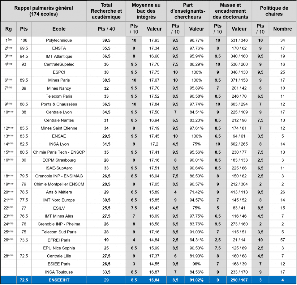- Recherche et Excellence académique (noté sur 40 points). Pour cette thématique l'N7 se classe au 22ème rang avec 29 points (voir classement recherche et excellence académique). Cette thématique reste un point fort de l'N7, où elle excellait il y a quelques années : 2ème en 2019, 5ème en 2020, 3ème en 2021, 4ème en 2022. Depuis, les critères de cette thématique ont légèrement évolués et incluent maintenant la politique de chaires qui reste un maillon faible de l'N7 (3 points sur 10). Il faudrait essayer de suivre l'exemple de l'INSA Toulouse qui avec ses 17 chaires distancie l'N7 de 6 points sur ce seul critère.