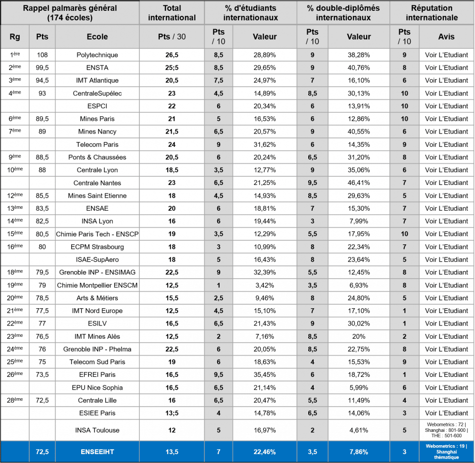 Dans son édition du 29 Janvier 2026, le magazine l’Étudiant a publié son classement des écoles d'ingénieurs pour 2026 (source : Classement 2026 des écoles d'ingénieurs) basé sur la méthodologie ici présentée. Le présent article reprend des résultats du classement de l’Étudiant et les présente différemment en ne considérant que les 14 critères qui contribuent aux 119 points maximum du classement général.