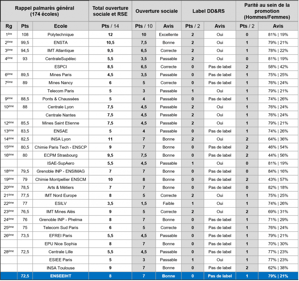 Détails du critère d'ouverture sociale et RSE pour les 28 premières écoles du palmarès général :