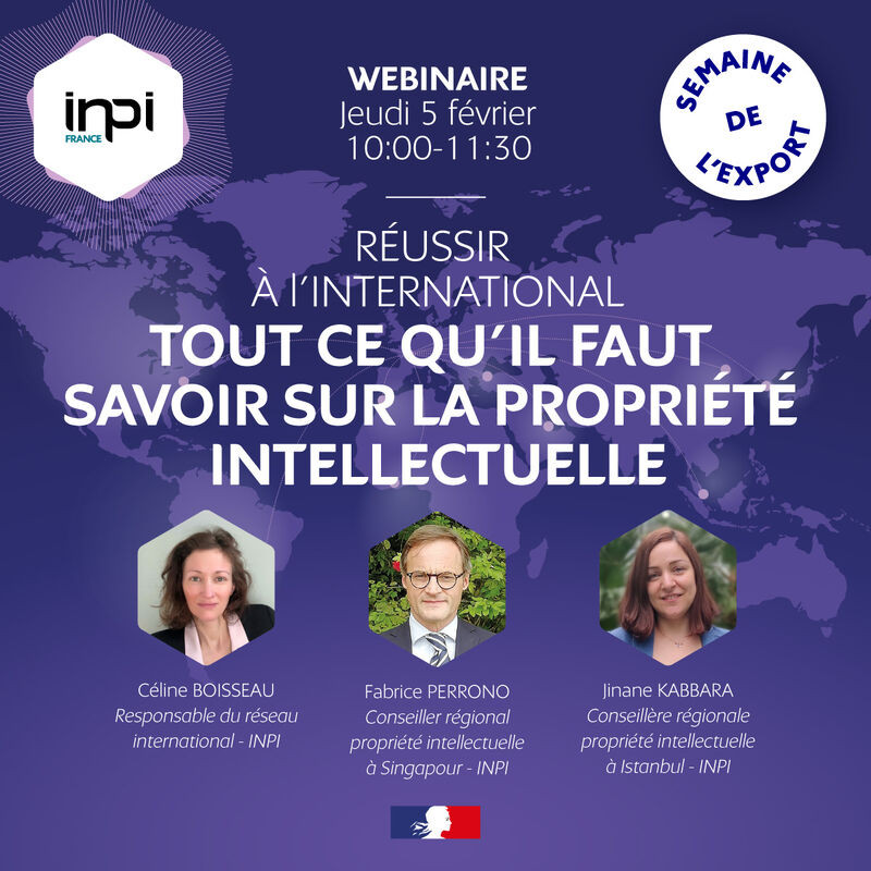 Dans la cadre de la JAM 2026 (Journée Accès au marché) une série de webinaires thématiques sont prévus, dont celui de l’INPI dédié à la propriété intellectuelle : "Réussir à l'international : tout ce qu'il faut savoir sur la propriété intellectuelle".
