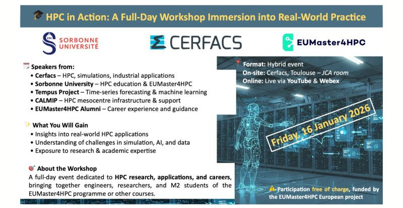 This one-day workshop offers a clear and accessible introduction to key HPC applications, technologies, and professional practices. Through presentations from Cerfacs, Sorbonne University, CALMIP, and the Tempus project, participants will discover how HPC is used across research and industry. The program also includes testimonials from EUMaster4HPC alumni, providing concrete insights into career opportunities in the HPC ecosystem. Designed for audiences familiar with HPC but not necessarily specialists, the workshop fosters exchanges, questions, and networking.