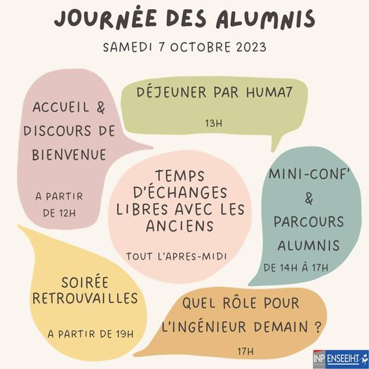 Un rassemblement des alumni N7 est prévu le samedi 7 octobre 2023 dès 12h à Toulouse dans les locaux de l'école. Cet évènement sera une opportunité de se retrouver autour d'un repas. Puis d'échanger, de partager nos expériences autour de tables rondes et conférences avec, en parallèle, des temps d'échanges libres et informels avec tous les alumnis présents.